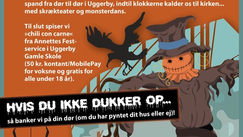 Desuden skrækteater & monster-band/dans i Uggerby Kirke efterfulgt af »Chilli con carne« i Gamle Skole (50 kr. for voksne). Tilmelding senest 24/10 på sms/tlf. 51670674 (soba@km.dk).